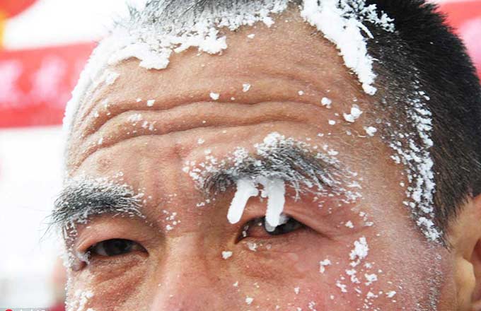 A baby stares at a Peking Opera artist at the Intangible Cultural Heritage Experience Center in Beijing, Dec 10, 2016. [Photo/IC] |