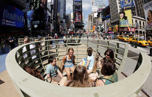 Tourists sit in the art installation "Meeting Bowls" by the Spanish collaborative mmmm in Times Square in New York August 17, 2011.