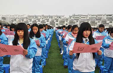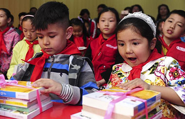 Cao Wenxuan presents books to children, Northwest China's Xinjiang