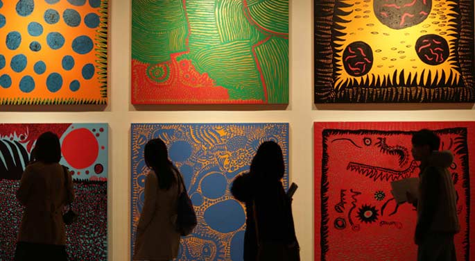 Visitors view Japanese artist Yayoi Kusama's works during her Asia tour exhibition in Shanghai, Dec 16, 2013.