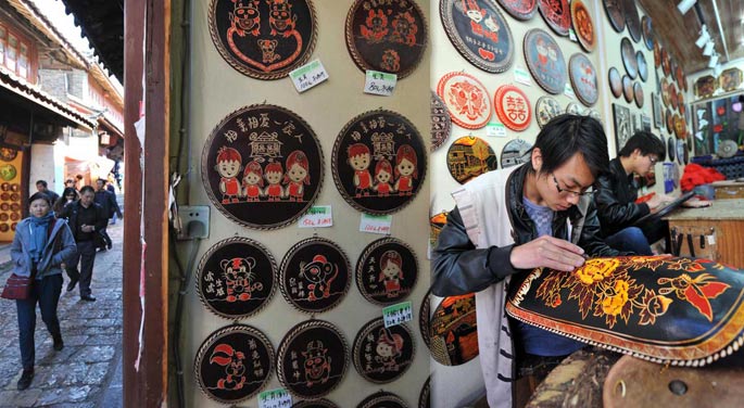 Many stores in Lijiang Old Town in Yunnan province are selling Dongba engravings, Nov 7, 2013.