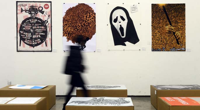 Visitors enjoy the top prize-winning work Werkschau 2013 from the Sixth China International Poster Biennial, in Hangzhou, Zhejiang province, Nov 28, 2013.