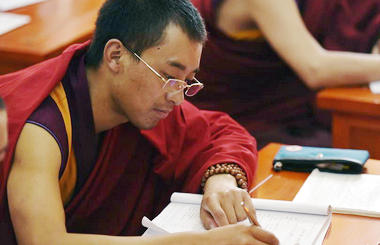 Monks have lesson at Qinghai Tibetan Buddhism College