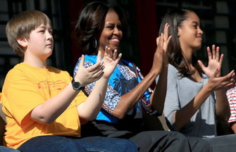 United States first lady Michelle Obama took time out from her China itinerary to watch a Peking Opera drama about monkeys with US students and teachers at the Summer Palace in Beijing on Saturday.
