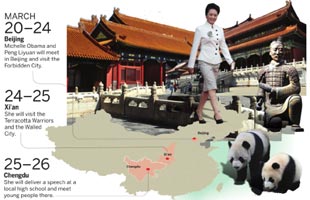 The US first lady Michelle Obama will travel to China from March 19-26, 2014. She will be visiting Beijing from March 20-23, Xi’an on March 24, and Chengdu from March 25-26.