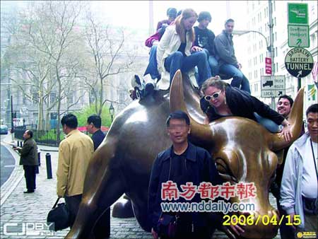 2006年,一位中國游客與銅牛合影,牛背上的外國游客成了背景。