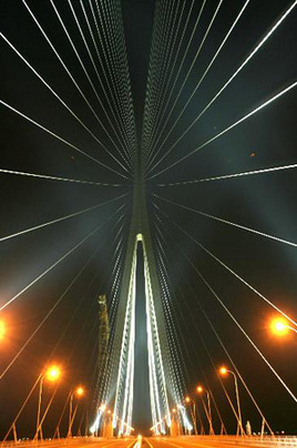Updated: 2008-06-30 15:09 ![]() 中國日報網環球在線消息:世界第一大跨徑斜拉橋蘇通大橋今天上午10時許在南通市正式順利建成通車。江蘇省省委書記梁保華、省長羅志軍等省市領導出席了今天的開通儀式。 蘇通大橋橫跨蘇州(常熟)和南通兩市,西距江陰大橋82公里,東距長江入海口108公里,是國家高速公路沈陽至海口通道的過江樞紐,也是江蘇省公路主骨架重要的過江節點。 蘇通大橋的建設,創造了世界橋梁建設最深基礎、最高橋塔、最長拉索、最大主跨四項世界紀錄,代表了世界建橋技術的最高水平。大橋路線全長32.4公里,其中跨江大橋長8146米,大橋主橋為跨徑1088米的斜拉橋,是世界最大跨徑的斜拉橋,此前最大跨徑斜拉橋的跨徑為890米;主墩基礎由131根長約120米、直徑2.5至2.8米的群樁組成,是世界規模最大、入土最深的群樁基礎;橋塔采用高300.4米的混凝土塔,為世界最高橋塔;大橋最長拉索長達577米,為世界最長拉索。 ![]() 5月25日,北京奧運會圣火在新建成的蘇通長江公路大橋上傳遞,標志著蘇通大橋實現試通車。江澤民同志為大橋題寫了橋名。試通車以來,蘇通大橋大大緩解了京滬高速公路和江陰長江大橋的壓力。 蘇通大橋建成通車,圓了南通人民的千年期盼和百年夢想。現在,從大橋過江只要7分鐘,南通到上海的車行時間比過去從汽渡過江縮短了1個小時左右,由此南通將快速融入蘇南板塊。同時,整個蘇中、蘇北地區與上海的時空距離也都大大縮短,跨入了與上海、蘇南“無縫對接”的時代。蘇通大橋的建成,對于完善國家和江蘇省高速公路網絡、緩解過江交通壓力,對于加強長江南北之間的交通和經濟聯系、主動接受上海輻射、推動長三角經濟一體化都具有十分重要的意義。 編輯:鄧京荊 來源:新華報業網 沈偉