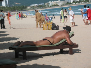 一名男性游客幾乎全裸地曬著太陽(yáng),絲毫不避諱來(lái)往的行人 中國(guó)日?qǐng)?bào)網(wǎng)環(huán)球在線消息:“三亞大東海景區(qū)自發(fā)形成裸泳浴場(chǎng),裸泳人數(shù)最多時(shí)達(dá)四五百人。”近日,一名三亞網(wǎng)民發(fā)貼稱,連日來(lái)他發(fā)現(xiàn)很多國(guó)內(nèi)外游客公然在三亞著名景區(qū)——大東海裸體游泳。同時(shí),還有很多三亞市民以及游客出于好奇心理,到大東海獵奇。該貼發(fā)出后立刻引起廣泛關(guān)注,裸體浴場(chǎng)到底是該禁還是該倡一時(shí)間眾說(shuō)紛紜。 據(jù)了解,黑龍江、四川、浙江等省份曾在公共旅游區(qū)設(shè)置過(guò)裸體浴場(chǎng),但由于裸泳與中國(guó)人的傳統(tǒng)道德觀念相悖,所以一直以來(lái)都備受爭(zhēng)議。三亞作為著名的國(guó)際化旅游城市,能否對(duì)裸泳“開(kāi)禁”?三亞市市長(zhǎng)陸志遠(yuǎn)對(duì)此向本報(bào)記者明確表示,市政府不可能在大東海等開(kāi)放式景區(qū)開(kāi)設(shè)裸體浴場(chǎng),并且短期內(nèi)也不可能設(shè)立專門(mén)的裸體浴場(chǎng)。至于以后是否設(shè)立裸體浴場(chǎng),那要看三亞向國(guó)際旅游城市發(fā)展的程度,并經(jīng)過(guò)專家論證后才能做出決定。 大東海自發(fā)形成裸體浴場(chǎng) 一名網(wǎng)友在網(wǎng)上發(fā)帖稱,不久前,他跟幾個(gè)朋友到大東海景區(qū)旅游時(shí)發(fā)現(xiàn)在南中國(guó)大酒店側(cè)面的沙灘上橫七豎八躺著五六十個(gè)全身裸體的男人。該網(wǎng)友的3名女性朋友見(jiàn)此情景,立刻掩面轉(zhuǎn)身往回走。“這些裸曬者年齡多在50-60歲,個(gè)個(gè)渾身黝黑,面對(duì)別人投來(lái)的目光,竟然泰然自若,毫無(wú)羞色?!边@名網(wǎng)友認(rèn)為,裸泳有損三亞形象,希望政府相關(guān)部門(mén)認(rèn)真管管此事。該貼發(fā)出后立刻引起廣泛關(guān)注,裸泳到底是該禁還是該提倡一時(shí)間眾說(shuō)紛紜。多數(shù)網(wǎng)友認(rèn)為,國(guó)外的裸泳是怎樣他們并不清楚,但是三亞畢竟是在中國(guó)境內(nèi),由于裸泳與中國(guó)人的傳統(tǒng)道德觀念相悖,在公共場(chǎng)合裸泳有損市容。 裸泳者毫不避諱來(lái)往行人 經(jīng)過(guò)幾天觀察,記者發(fā)現(xiàn)大東海景區(qū)沙灘,的確有不少裸泳、裸曬游客。在大東海景區(qū)東、西兩側(cè)均有裸泳、裸曬者,西側(cè)寶宏酒店沙灘上主要以國(guó)外客人為主,東側(cè)南中國(guó)酒店沙灘主要以內(nèi)地客人為主,他們大部分都是中年男人,一來(lái)到海邊就先在海里游泳,然后擺出一副旁若無(wú)人的樣子赤裸著躺在沙灘上曬太陽(yáng)。 在寶宏酒店沙灘,一名外國(guó)女性客人在沙灘椅上裸露著上半身悠閑看書(shū),隔之不遠(yuǎn)處有一名外國(guó)男客人一會(huì)下海,一會(huì)上岸裸曬,全然不顧身旁在沙灘上玩耍的國(guó)內(nèi)游客。 在南中國(guó)酒店西側(cè)海灘,十多名男子赤裸裸地曬太陽(yáng),裸曬者均為男性,他們?nèi)沓嗦?,皮膚曬得很黑。據(jù)裸曬者自己解釋,他們裸曬是為了治療皮膚病。記者問(wèn)他們?yōu)槭裁床贿x擇隱蔽的地方裸曬,他們并沒(méi)有回答。 據(jù)了解,大部分裸泳者操內(nèi)地口音,南中國(guó)酒店保安部的鐘先生說(shuō),前幾年來(lái)的還只是三五個(gè)人,近兩年“三亞大東海可以裸泳”的名聲傳出去了,來(lái)三亞旅游的很多游客就“慕名”而來(lái),并形成了一定的規(guī)模,最多的時(shí)候達(dá)到了四五百人,他們大部分是內(nèi)地來(lái)的,很多都是皮膚病患者。 游客隨意裸露管理遇尷尬 南中國(guó)酒店一名管理人員說(shuō),自2002年以來(lái),他們酒店沙灘上就出現(xiàn)了裸泳者,但是尚不成規(guī)模,近幾年來(lái)才自發(fā)形成較大規(guī)模,尤其是每年的冬天人特別多,裸泳者大部分是皮膚病患者,他們只要一下海,客人就不敢下海游泳,紛紛前來(lái)投訴,酒店保安出面但是又不能采取強(qiáng)制措施,只能勸導(dǎo)或者建議其穿上衣服。曾經(jīng)還因?yàn)橐l(fā)爭(zhēng)執(zhí)報(bào)過(guò)幾次警,但是警察來(lái)了也只能出面調(diào)解或者勸其穿衣服而已,因?yàn)闆](méi)有相關(guān)法律禁止這種行為。他們?cè)?jīng)也向有關(guān)政府部門(mén)反映,但都沒(méi)有下文。 南中國(guó)酒店保安部的鐘經(jīng)理稱,游客剛開(kāi)始在某部隊(duì)度假村前的沙灘裸曬,被制止后,他們都擠到南中國(guó)酒店沙灘,一般內(nèi)地人居多,國(guó)外游客相對(duì)較少。裸曬者大部分是皮膚病患者,有傳染性。酒店保安出面干涉,裸曬者還振振有辭:“這是公共沙灘,我們可以隨意曬太陽(yáng)?!? 鐘經(jīng)理說(shuō),酒店無(wú)權(quán)強(qiáng)制干預(yù),只能勸導(dǎo),但遇上不講理的游客,還真是無(wú)法有效解決,希望政府采取相關(guān)措施。 |