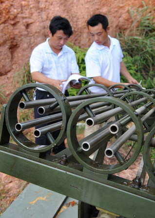 7月22日,湖南省瀏陽市氣象局工作人員正檢查一輛待命的車載式火箭發射器。 新華社記者 龍弘濤 攝