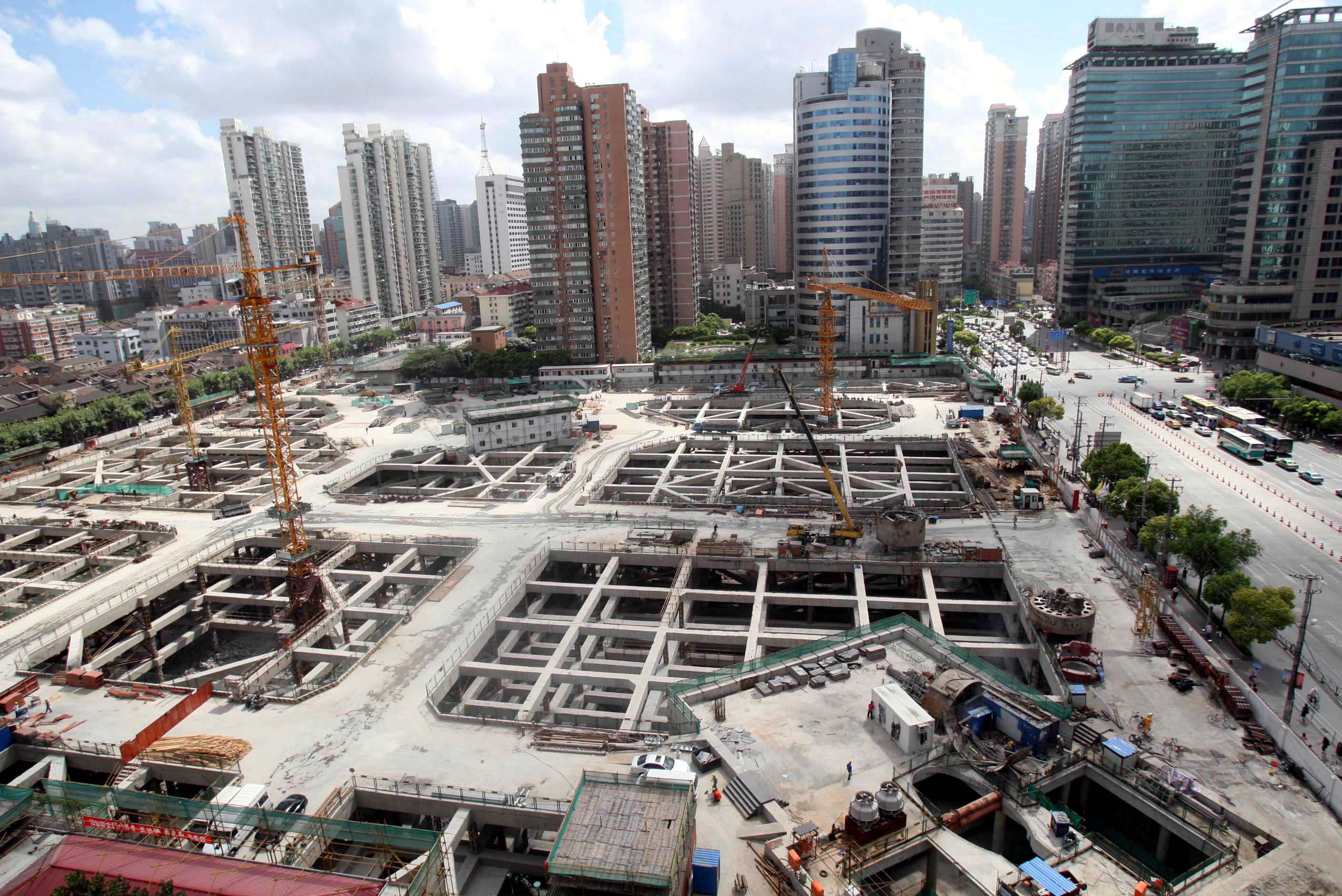 7月28日拍攝的上海盧灣區第55街坊工程工地。 當日,上海鬧市區整體開挖面積最大的基坑工程——4萬多平方米的盧灣區第55街坊工程,順利完成開挖,橫穿其下的軌道交通9號線打浦橋車站也同時封頂。軌交車站與大型商業建筑在鬧市中心同步建設,意味著申城地下三維空間開發取得新進展。