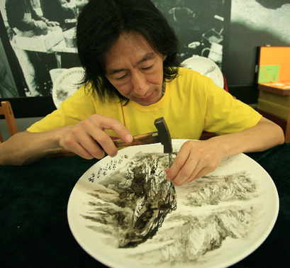 陶瓷刻磁藝術(shù)家在進(jìn)行表演