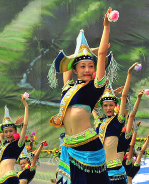10月13日,馬關(guān)縣舉辦的首屆民間藝術(shù)節(jié)開幕式上,少數(shù)民族演出大型文藝節(jié)目《藝鄉(xiāng)歡歌》。 當日,云南省文山壯族苗族自治州馬關(guān)縣,舉辦了以大型民間文藝展演、神彩云南農(nóng)民版畫展、村寨原生態(tài)民俗展示等系列文化活動組成的首屆民間藝術(shù)節(jié)。該縣居住著漢、壯、苗、彝等11個民族,被文化部命名為“中國民間藝術(shù)之鄉(xiāng)”。(新華社記者 陳海寧 攝)