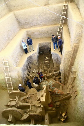在甘肅省張家川回族自治縣馬家塬戰國墓地考古發掘現場,部分考古和文物保護專家在參觀戎人豪華墓葬(10月18日攝)。(新華社記者王艷明 攝)