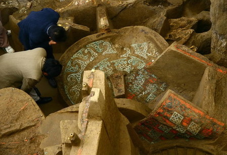 在甘肅省張家川回族自治縣馬家塬戰國墓地考古發掘現場,部分考古和文物保護專家在參觀戎人豪華墓葬出土車乘上的華麗裝飾(10月18日攝)。(新華社記者王艷明 攝)