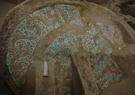 甘肅省張家川回族自治縣馬家塬戰國墓地戎人豪華墓葬出土車乘上的精美銅箔飾(10月18日攝)。(新華社記者 王艷明 攝)
