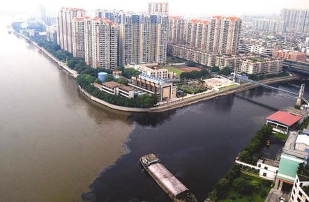 在珠江荔港南灣段,濃黑廢水把半邊珠江染成黑色。(朱文海 吳進攝)