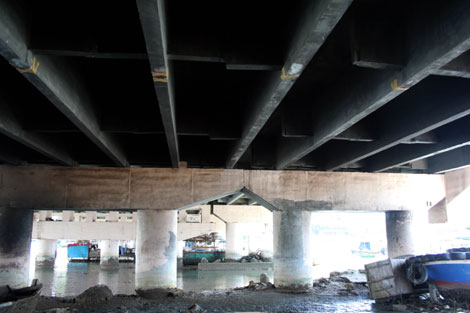 三亞大橋橋底有多處“補丁”(10月23日攝)。自2007年11月被權(quán)威部門檢測為危橋的海南省三亞市三亞大橋至今仍“帶病服役”。三亞大橋建于20世紀60年代,連接三亞東西城區(qū)主干道,車流量極大,負荷高,一些船舶違規(guī)停在橋墩下,不少行人和車輛仍進入橋梁被封閉的禁行區(qū),安全隱患重重。2008年1月17日,三亞市政府通過三亞大橋拆除重建方案,但是據(jù)三亞規(guī)劃局的消息,該方案要等到三亞河上的新風(fēng)橋重建完工后才能正式上馬,至少需要再等1年時間。 (新華社記者 鄧伽 攝)