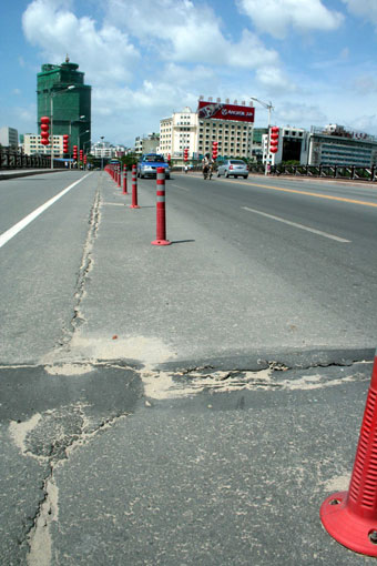三亞大橋橋面上有多處裂縫(10月23日攝)。自2007年11月被權威部門檢測為危橋的海南省三亞市三亞大橋至今仍“帶病服役”。三亞大橋建于20世紀60年代,連接三亞東西城區主干道,車流量極大,負荷高,一些船舶違規停在橋墩下,不少行人和車輛仍進入橋梁被封閉的禁行區,安全隱患重重。2008年1月17日,三亞市政府通過三亞大橋拆除重建方案,但是據三亞規劃局的消息,該方案要等到三亞河上的新風橋重建完工后才能正式上馬,至少需要再等1年時間。 (新華社記者 鄧伽 攝)