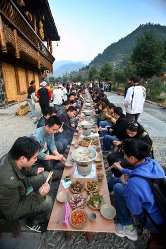 11月10日,游客正在品嘗苗家長桌宴。當日,為期三天的2008中國貴州雷山苗年節(jié)在雷山縣西江千戶苗寨拉開帷幕。據(jù)悉,今年的苗年節(jié)以“觀千年苗族神韻,品萬戶苗家美食”為主題,期間將舉行豐富多彩的群眾文娛活動。