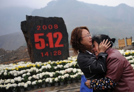 青川東河口地震遺址公園,村民楊海瓊和母親蔣萬瓊在自己被地震摧毀的家園前痛哭,他們一家15口人僅僅幸存5個人。(雷宇 攝) |