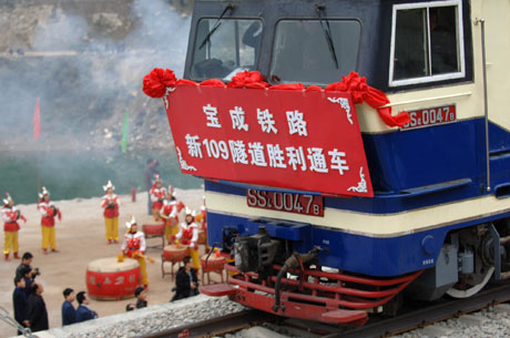 11月12日,群眾在寶成鐵路新109隧道旁敲起鑼鼓,慶賀隧道通車。 當日下午,隨著57006次貨車緩緩通過,寶成鐵路新109隧道正式通車。汶川地震發生時,位于甘肅省徽縣境內的寶成鐵路109隧道被崩塌的山體掩埋,行駛在隧道內的貨車脫軌起火,其中12節油罐車隨時有爆炸危險,寶成鐵路中斷。經過搶險人員12個晝夜的奮戰,109隧道于5月24日恢復通車。 雖經搶修加固,遭受嚴重損毀的109隧道自身結構和強度已不能保證長期行車安全需要,列車只能限速運行。為此,鐵道部決定實施109隧道改線搶險工程。建成的新109隧道位于既有寶成鐵路北側、嘉陵江對岸,全長873米,內部采用鋼筋混凝土襯砌,堅固性和抗震性能得到大幅度提高。新建線路比原線縮短486米,列車通過速度可由原來的每小時60公里提高到80公里,比計劃工期提前1個月通車。 新華社記者丁海濤攝