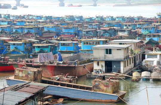 11月18日拍攝的擱淺在北江廣東清遠段的大批貨船。新華社發(李作描 攝)