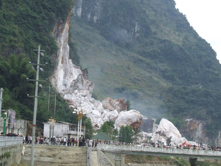 | 11月23日,救援人員正在事故發生現場展開緊張救援。 11月23日11時35分左右,廣西河池市鳳山縣發生一起嚴重地質災害事故。在距鳳山縣城約1公里的鳳山至巴馬二級公路上,有四五萬立方米石方塌下,300多米的路面被填埋。據現場救援指揮部初步統計,事故造成6棟樓房,19間房屋被埋。截至19時,搜救人員已在現場發現1名遇難者,此外還有6名傷者已經被送往醫院救治。初步估計還有5人被埋。 新華社發(周恩革 攝) |
