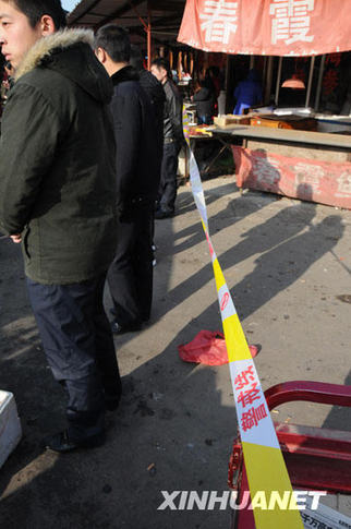1月7日,河北三河市燕郊行宮活禽市場活禽交易區域已全部關閉,市場保安人員在現場警戒線前守護。(新華社記者 王民 攝)