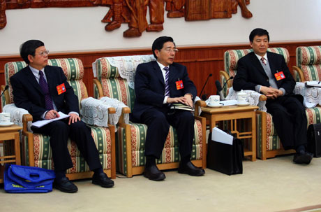 | 參加人代會的代表們在會上討論政府工作報告。(火炎 攝) |