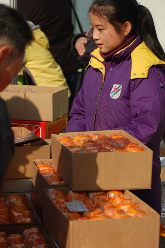 1月14日,衢州柑桔(胡柚)杭州春節促銷會在浙江省農展館舉辦。圖為一個在現場隨家人賣柑桔的小姑娘,她好像并不發愁眼前整箱賣不出去的柑桔。