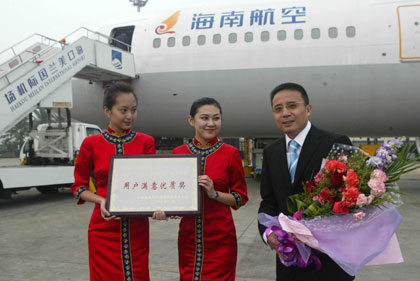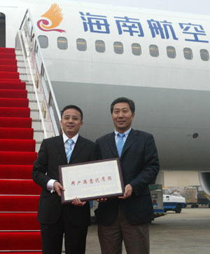 中國(guó)日?qǐng)?bào)網(wǎng)環(huán)球在線消息:2009年1月23日,記者獲悉,在中國(guó)民航協(xié)會(huì)用戶工作委員會(huì)召開的“2008旅客話民航用戶評(píng)價(jià)結(jié)果發(fā)布會(huì)”上,海南航空再次榮獲“旅客話民航”活動(dòng)年度旅客運(yùn)輸量500-2000萬(wàn)人次組評(píng)比“用戶滿意優(yōu)質(zhì)獎(jiǎng)”。這是海航連續(xù)獲得此項(xiàng)殊榮的第十個(gè)年頭。1月23日下午,海航HU7182航班緩緩降落??诿捞m機(jī)場(chǎng),海航總裁助理胥昕手捧獎(jiǎng)杯走下客艙舷梯,受到海航副總裁牟偉剛及各部門領(lǐng)導(dǎo)員工的夾道迎接,在場(chǎng)人員喜悅之情溢于言表,場(chǎng)面溫馨而熱烈。