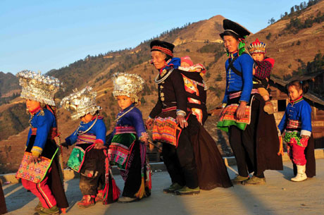 1月30日,苗族婦女和兒童跳起錦雞舞。 當日,在貴州省丹寨縣排調鎮麻鳥村,苗家男女老少身著節日盛裝,聚集在山坡上,跳起獨特的苗族錦雞舞,祈求牛年吉祥如意、幸福安康。 新華社發(秦剛 攝)