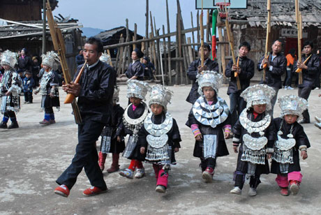 1月31日,劍河縣南寨鄉(xiāng)展留村的苗族兒童跳蘆笙舞。當(dāng)日是貴州省劍河縣南寨鄉(xiāng)展留村民間傳統(tǒng)的“錫繡苗族姊妹節(jié)”的第二天。每年農(nóng)歷正月初五至初七為展留村舉辦“錫繡苗族姊妹節(jié)”的日子。節(jié)日期間,村民們舉行祭祖、跳蘆笙舞、吃“森林長桌飯”、馬郎歌會等民俗活動。 新華社發(fā)(喬啟明攝)