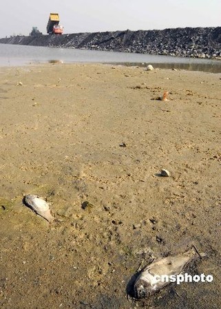2月4日,在安徽淮北臨渙礦濕地內,因連月干旱湖內水位急劇下降,幾只重約一斤以上的花鰱魚未能及時游離而渴死岸邊。 中新社發陳幫干 攝