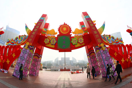 元宵燈會的入口是大牛角造形。第三屆福州南后街元宵燈會準備就緒,制燈布燈到位,五一廣場13個燈組1200多盞傳統花燈,5日晚正式亮燈。今年元宵燈會以“弘揚閩都文化,傳承中華文明”為主題。重點設置13組大型燈組,展示福州市歷史文化、民俗文化,突出傳統美德故事,并與過年鬧元宵、伬唱、評話等傳統民俗文化融為一體。(福建日報記者 祝敏松 攝) |