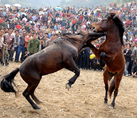 2月10日,兩匹公馬正在酣斗。 當日,廣西融水苗族自治縣香粉鄉數十支蘆笙隊和上萬名各族群眾在古龍坡舉行大型坡會活動,祈盼牛年風調雨順、幸福安康。坡會是苗族群眾的民間傳統節日,通常在每年春季的農歷正月初三至正月十七舉行,內容包括祭祀儀式和比賽娛樂項目等,豐富多彩,熱鬧非凡。 新華社記者 張愛林 攝