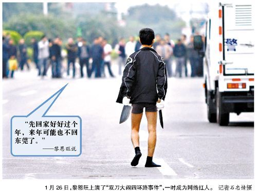 1月26日,黎恩旺向原工作單位索要三萬元開發廊店,遭到拒絕當即脫掉衣褲,持兩把殺豬刀大鬧東莞四環路。隨后,在媒體的報道下,以其桀驁的表情、經典的話語,迅速走紅網絡,被稱“雙刀男”。他自稱“沒衣服、沒飯吃,就只能去偷去搶。并不是我不想做好人,是家庭環境、社會現實沒有給我機會。有錢人什么都有,我連煙都沒得抽。與其茍且活著,不如通過這樣來改變命運。”