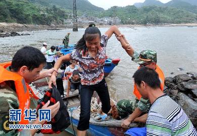 9月19日,福建省連江縣黃岐邊防派出所官兵在幫助海上養殖人員緊急轉移上岸。新華社記者張國俊攝