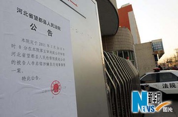 1月25日,在河北省望都縣人民法院門口張貼的公告。1月26日,河北省望都縣人民法院將開(kāi)庭審理河北省望都縣人民檢察院提起公訴的被告人李啟銘涉嫌犯交通肇事罪一案。10月16日晚,李啟銘酒后駕車在河北大學(xué)新校區(qū)生活區(qū)將兩名女生陳某、張某撞傷,后陳某因搶救無(wú)效死亡。新華社記者鞏志宏 攝