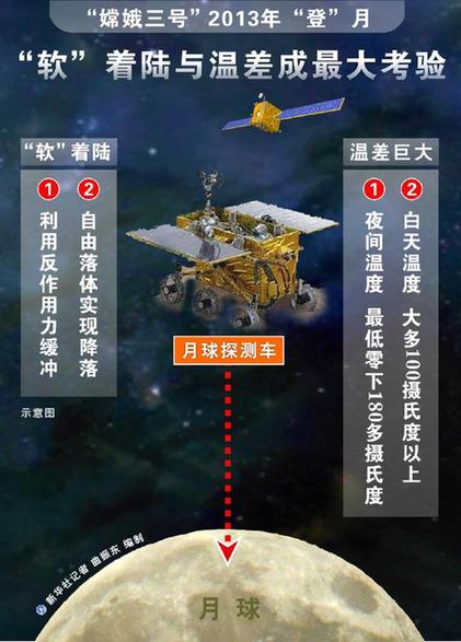 “穩穩當當地在月球表面實現‘軟’著陸是一個難題?!睔W陽自遠告訴新華社記者,“嫦娥一號”是撞月“硬”著陸。“嫦娥三號”是“軟”著陸,不能使用降落傘。目前研究團隊已計劃在接近月球表面時首先利用反作用力緩沖,然后讓“嫦娥三號”自由落體實現降落。