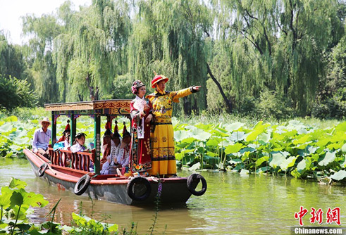 “皇上”攜“甄嬛”泛舟湖上 圓明園內(nèi)賞荷塘美景
