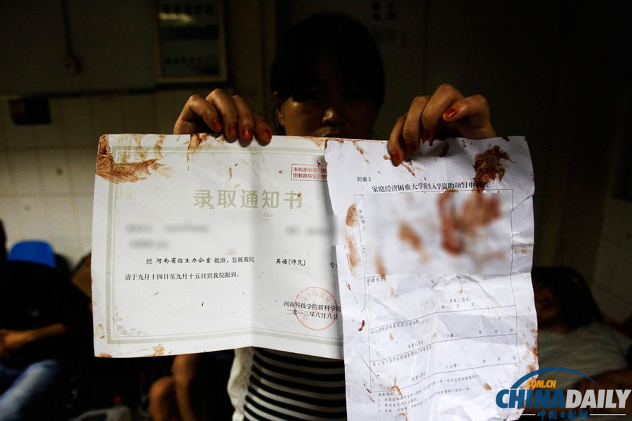 8月20日凌晨,受害者王園園的姑姑在醫(yī)院重癥監(jiān)護室門前拿出侄女帶血的大學(xué)錄取通知書。(向明超 攝)