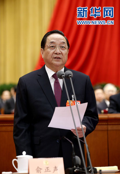 2013年3月3日,中國人民政治協商會議第十二屆全國委員會第一次會議在北京人民大會堂開幕。俞正聲主持開幕會。新華社記者鞠鵬攝