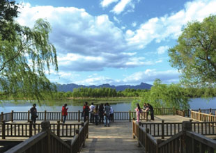 出延慶縣城,沿媯水河往西約4公里,路兩側(cè)綠樹繁花,鳥鳴啾啾,遠山和近水相望,這里是媯河森林公園中的半山湖景區(qū)。延慶縣世園會籌備辦副主任張春元介紹,世園會園區(qū)占地為960公頃,劃分為圍欄區(qū)和非圍欄區(qū),核心展覽區(qū)即在半山湖一帶。