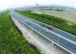 5月9日,車輛在通車的京津塘高速公路天津北部新區段的高架上行駛。該段工程從2014年7月9日開始斷交施工,全長12.9公里,將京津塘高速公路原來天津市區路基段改造成高架橋梁,為天津市區到北部新區的交通讓出空間。