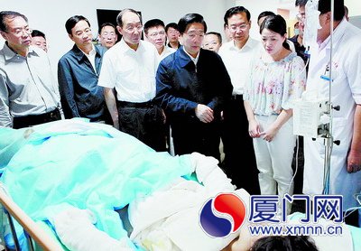 7日廈門公交車起火案件發生后,我市積極救治受傷人員。國務委員、公安部部長郭聲琨,省委書記尤權、省長蘇樹林,省委常委、廈門市委書記王蒙徽,市長劉可清前往受傷人員集中收治的醫院,看望慰問傷員。