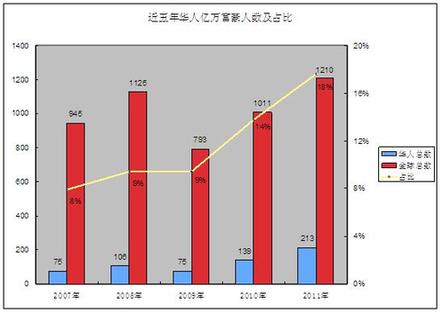 “近5年來,華人富豪在總?cè)藬?shù)和財富數(shù)量上的全球占比不斷增加,已成為僅次于美國富豪的全球第二大財富圈。”依托全球富豪榜的基礎(chǔ),福布斯昨日發(fā)布了2011年全球華人富豪榜,按照10億美元身家的上榜門檻計算,共有213位華人上榜,其總值高達(dá)5669億美元,占全球億萬富豪總量的12.6%。