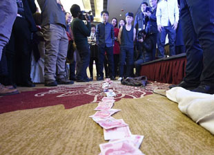2015年2月14日,在吉林省吉林市的一處覆蓋積雪的空地上,今年45歲的美術教師周曉峰用雙腳踩出一朵巨型玫瑰花,作為情人節禮物送給愛人。周曉峰拉著愛人,循著腳印走過巨型玫瑰花。