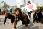 昨日上午10時30分許,康毅和其他3名同伴來到光谷雕塑廣場。在宣布活動開始后,他與另外2名男子用狗鏈套上脖子,同伴劉小姐則牽起鏈子,帶著3人開始在地上爬行。之后,康毅更匍匐在地,舔舐女子腳上的鞋子。