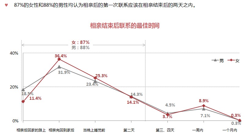 “欲迎還拒”與“淺嘗輒止”如果相親結束后雙方感覺還好,在男性提出女性回家時,女性的態度是“欲迎還拒”,男性則表現“淺嘗輒止”的特點。年齡越小的男性堅持送女生回家的比例越高。社會階層越高的女性越傾向于接受男性送自己回家。如果雙方感覺還好,99%的男性都會在相親后先聯系女性。87%的女性和88%的男性均認為相親后的第一次聯系應該在相親結束后的兩天之內。